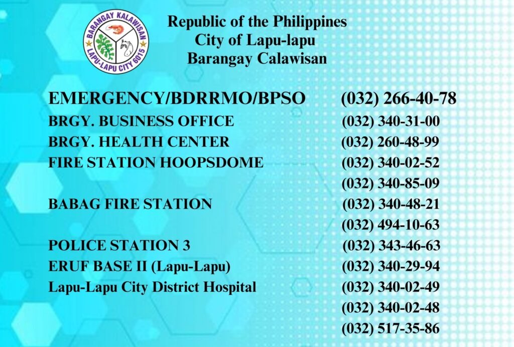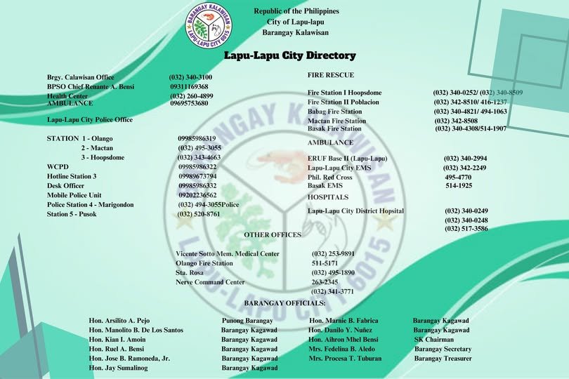 An official reference guide featuring key barangay offices, contact numbers, and essential community information for public use.