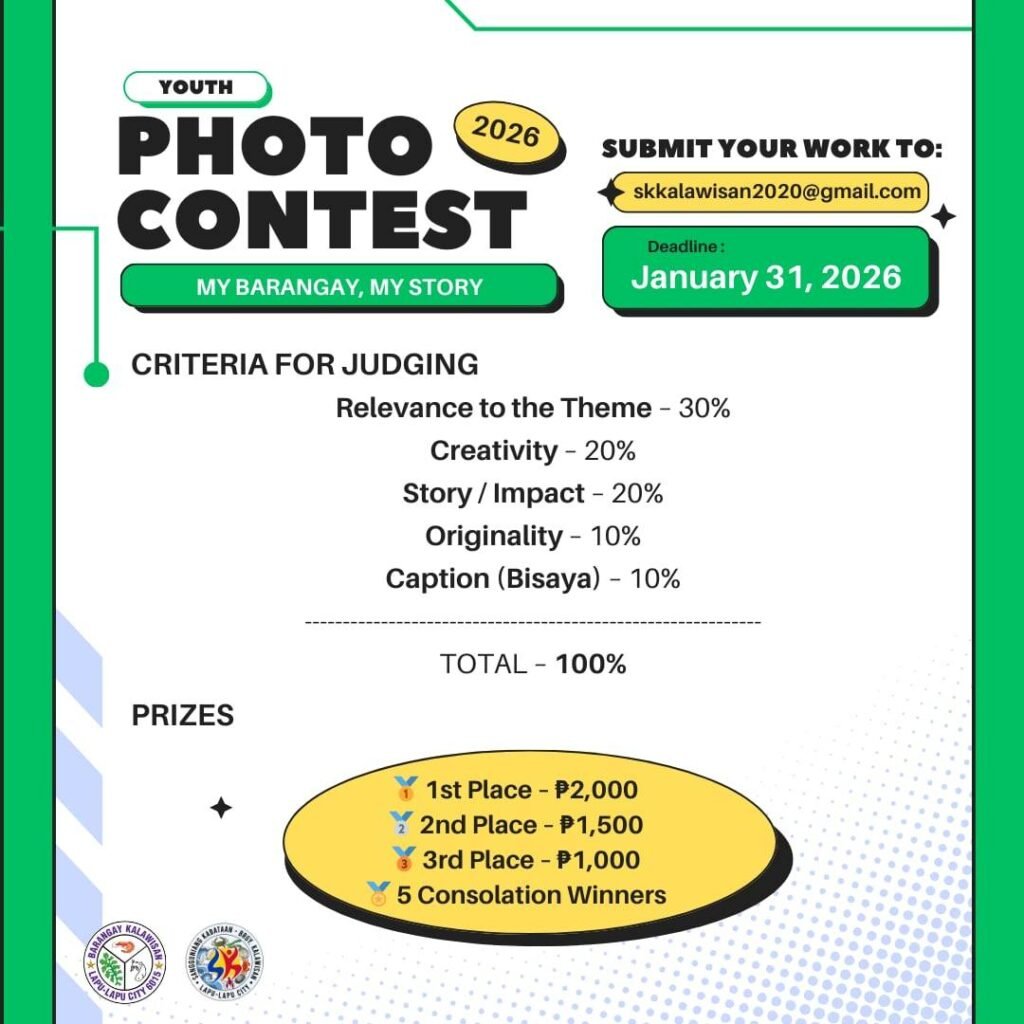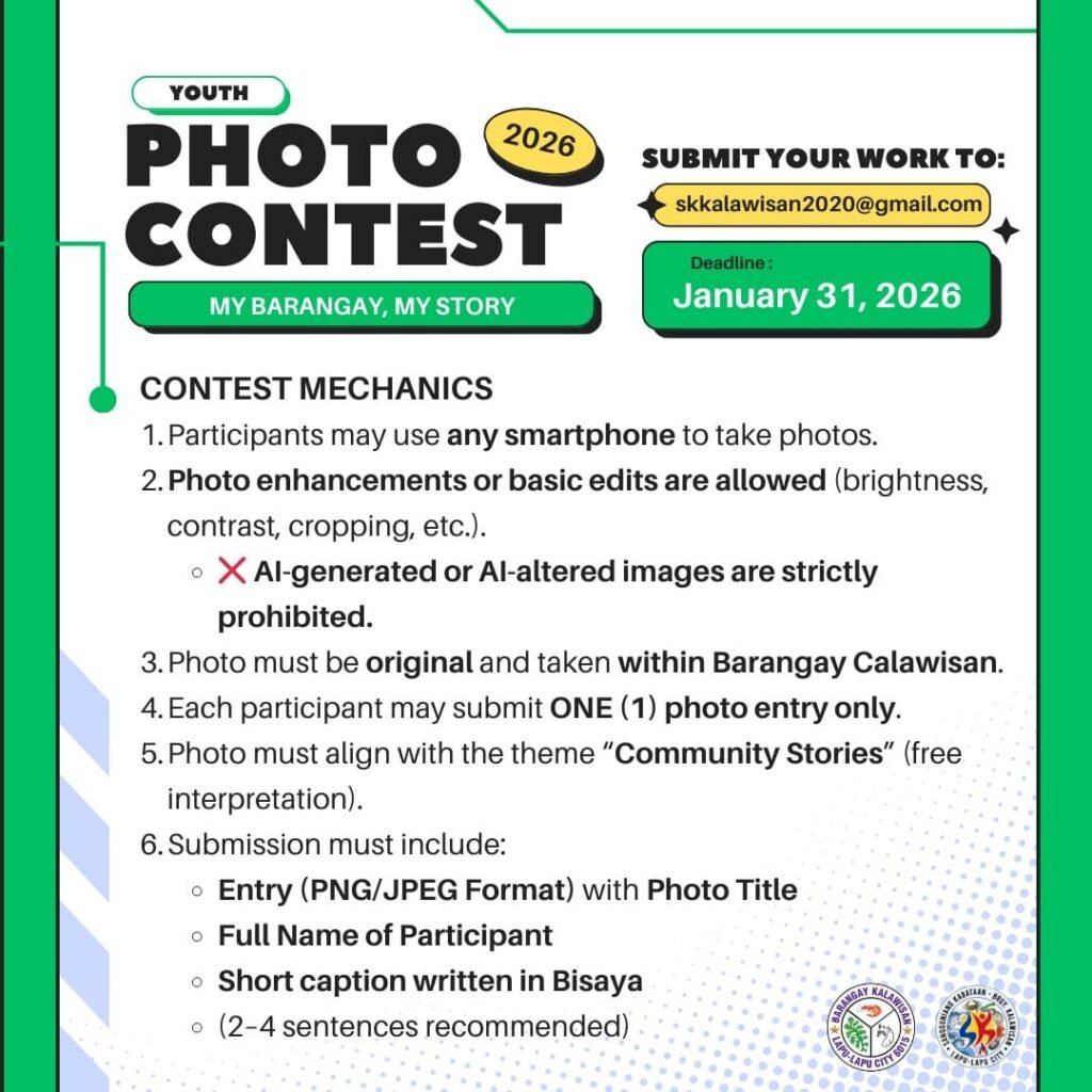 The Sangguniang Kabataan of Barangay Calawisan invites all youth to join the My Barangay, My Story: Youth Photo Contest – Community Stories. Capture the heart of our barangay through your lens and share your story with us!
