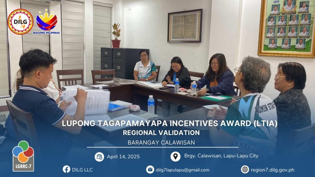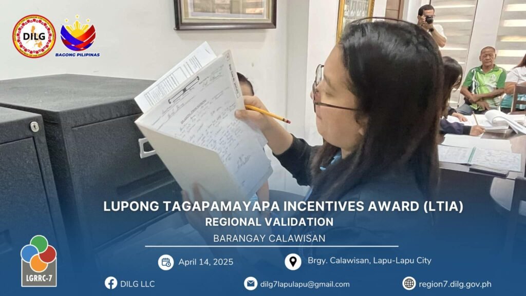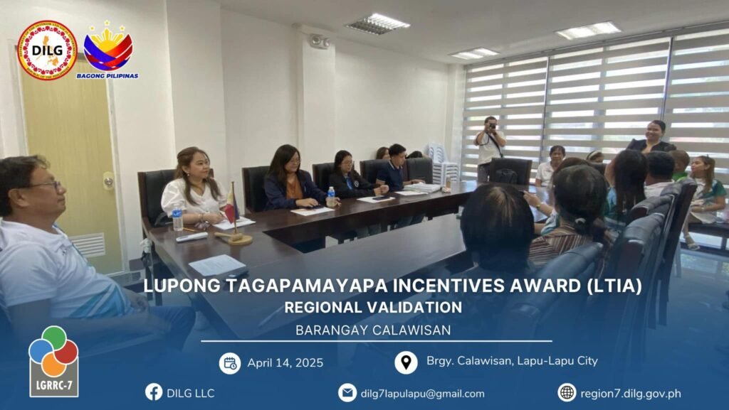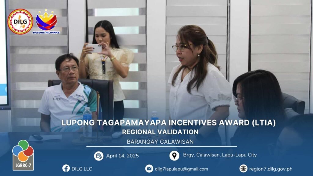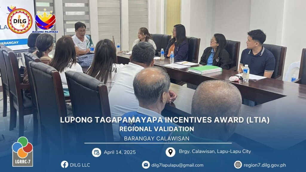 Following the City Level Lupong Tagapamayapa Incentives Awards (LTIA) Assessment from March 11 to April 11, 2025, Barangay Calawisan emerged as the top barangay in Lapu-Lapu City, ranking ahead of Basak and Caw-oy. This outstanding performance qualified Calawisan to represent the city in the Regional LTIA Onsite Validation held on April 14, 2025.
